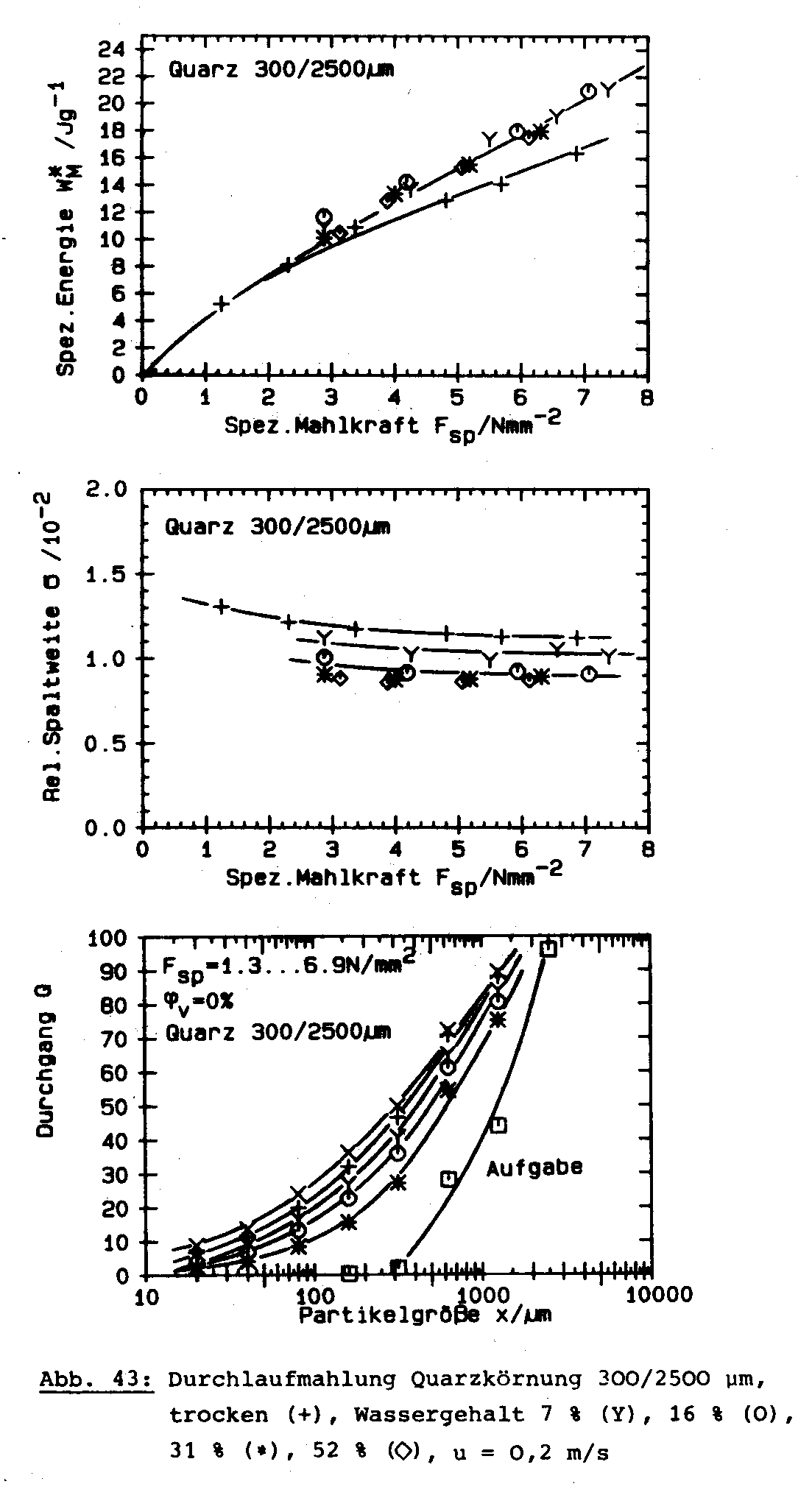 This page as well as the following web pages show the results of Schwechten [2] of single pass grinding tests with limestone, quartz, Rammelsberg ore and cement clinker as well as a simulated closed circuit grinding test with Kieserit at variation of feed size, moisture content and roller speed.