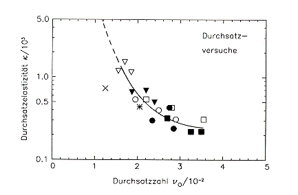 Throughput number n0 and throughput elasticity k for 1.) smooth rollers, all particle size fractions, x quartz * limestone and 2.) corrugated rollers, quartz v 0.25/1.0 o 1.6/6.3 [] 0.1/6.3 and limestone v 0.25/1.0 o 1.6/6.3 [] 0.1/6.3 |