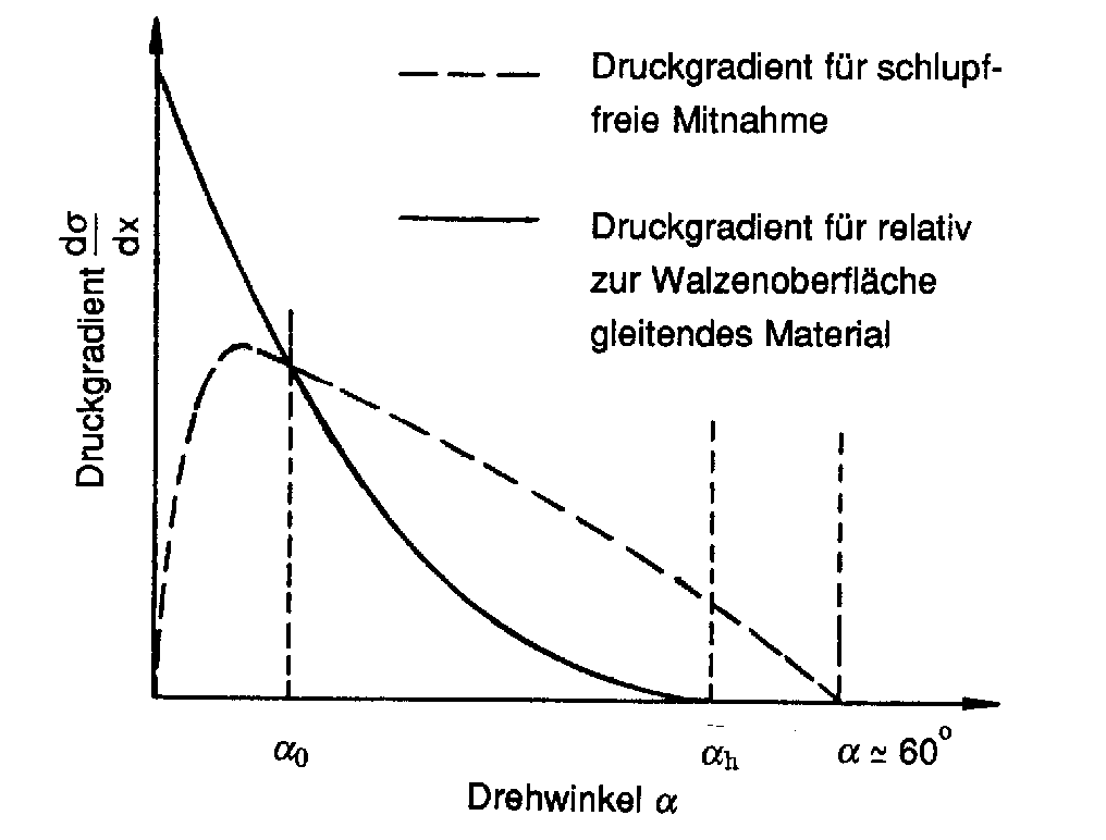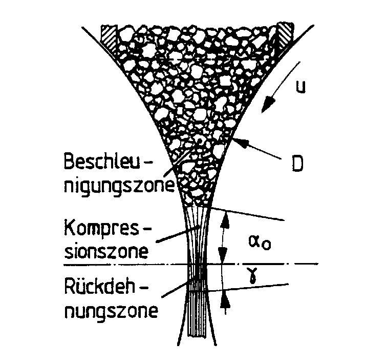 In the monography of Herrmann [10] different theories about the stress situation during the compaction in briquetting rollers are shown including the theory of Johanson [8] which is commonly ackknowledged today. The core point of his publication is the determination of the compression angle a0 (which Johanson calls nip angle a). For the determination he calculates the stress situation in the acceleration zone with methods of the bulk material mechanics, assuming conditions of stationary flow with constnacy of volume. That means that slip exists between material and rollers. In the compression zone the relation between compression and pressure is approximated with a power law assuming a slip-free material transport. Both physical regularities are extrapolated beyond their area of validity and differentiated in order to determine the stress gradient vertically to the shaft level, see example in the right picture above. Both curves cross each other whereat - due to physical reasons - always only the smaller gradient can exist. The intersection therefore describes the compression angle. This theory does not deliver an explicit equation but a numerical solution for the calculation of a0. The following parameters are part of the calculation scheme: relative gap width (s/D), effective friction angle, outer friction angle, compressibility of the bulk material. Systematic experimental investigations regarding this theory are not existing. Tundermann and Singer [13,14] have measured the solid volume portion of metal powders in the compression zone.For this purpose a briquetting press was stopped and the material was taken out of the gap and cutted into stripes. The quotient of the densities of two consecutive stripes shows a trend similar to the dotted line in the right picture above. Herrmann und Rieger [11] investigate the applicability of the Johanson-theory for the design and layout of briquetting machines with regard toroller force and driving power. The compression distribution is not measured. The theoretical values are significantly underestimating the measured values, possible root causes are discussed. Unfortunately the power law for the compression of a material bed used by Johanson has one disadvantage: It does not comply with the physical constraint that the solid volume portion d can only reach a maximum of one. An approximation which complies with this constraint was proposed in [18] and was also experimentally proven. It is: q = 1 - exp [- (p/pc)n] q = (d - d0) / (1 - d0) Vinogradov and Katashinski [9] were the first who measured compressive and shear forces during the compression of metal powders with a sensor pin (diameter 1,3 mm). The pressure shows the expected trend with a maximum and a steeper decrease than increase. The shear force is changing the prefix during the increase of the pressure. From this the authors conclude that in analogy with the metal rolling that material transport is slip-free only in this one point and that it is slower before and faster behing this point. But this interpretation is questionable as shear forces can also exist without relative movement. The angle coordinate is not shown. Therefore the position of the pressure maximum can not be taken from those results. Feige used the sensor-pin-method for the measurement of the peripheral and axial pressure distribution during the comminution between two rollers with different diameter [15,16]. The sensor pins were placed in three different levels and had a diameter of 8 mm, the big roller had a diameter of 720 mm and the diameter of the small roller could be changed between 72 and 200 mm.The gap width was fixed. The testing material was a limestone fraction between 0,2 and 3,1 mm and the material flow was adjusted in a way to get solid volume portions between 32 and 54 %. Under these circumstances pressures up to approximately 1 MPa were measured showing a strong pressure decrease towards the edges of the rollers. Significant hints regarding the axial pressure drop are also given by the lower comminution effect and less wear towards the roller edges. The lower comminution effect was observed by Schwarz and von Seebach [17] during tests with cement clinker on an industrial roller mill with D = 1400 mm and L = 660 mm. The wear picture in a roller mill with D = 1700 mm and L = 630 mm was investigated by Galanulis [19]. The objective of Lubjuhn’s work was to investigate and characterize the basics of the material transport and the pressure distribution in high compression roller mills.In terms of experiments that means: Determination of throughput, observation of particle movement and measurement of the pressure distribution in the gap of a high compression roller mill with variation of type of feed material size of feed material grinding force circumferential speed roller profile