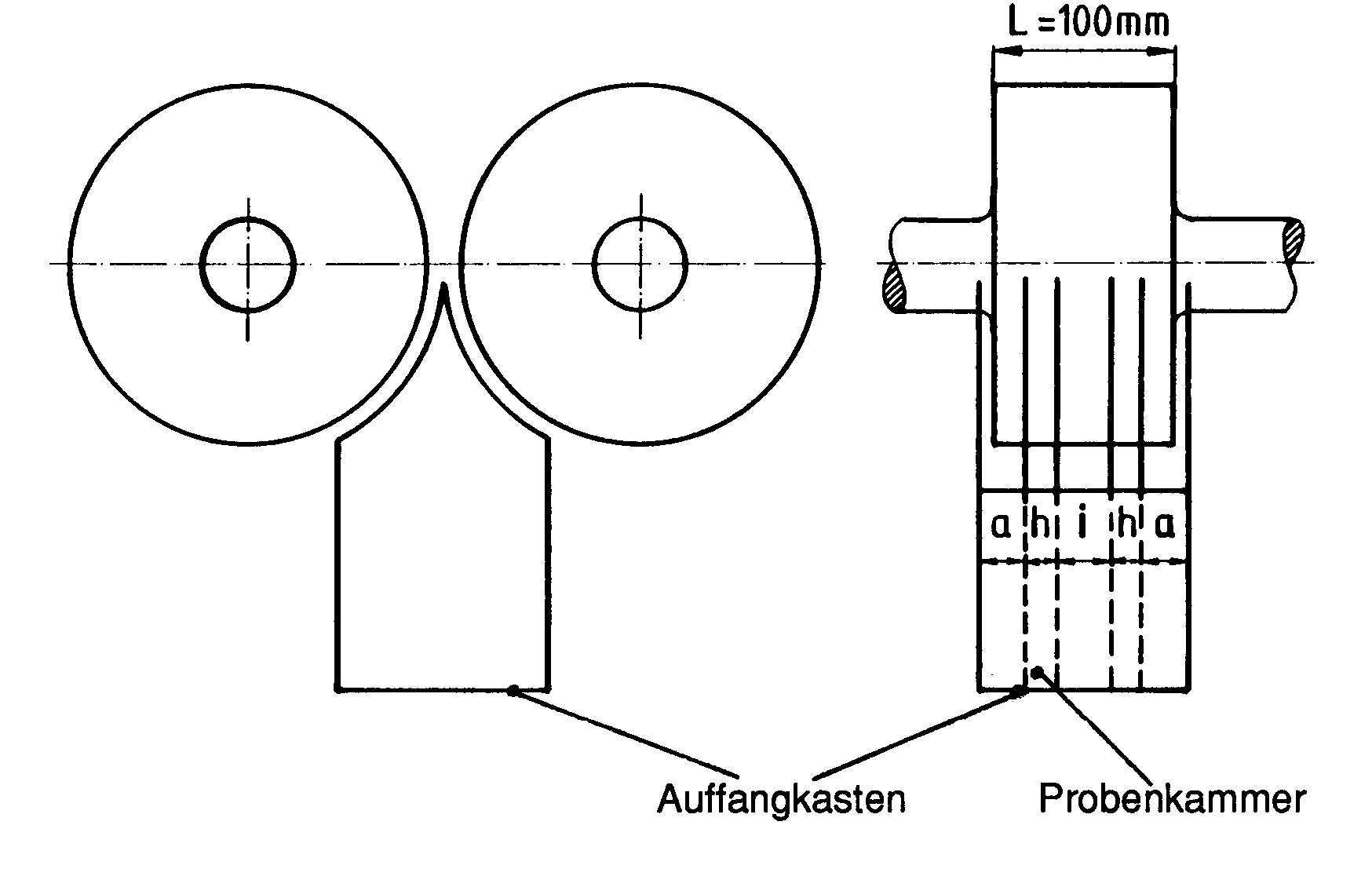 this purpose a sampling box with chambers was mounted underneath the rollers.The chamber walls divide the working length of the roller into stripes of 16.7/16.7/33.3/16.7/16.7 mm. After the test the
