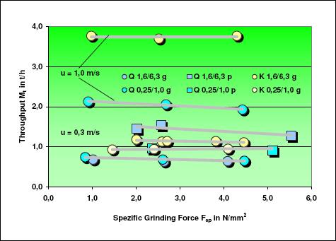 In each case the test results with smooth and moulded rollers arrange themselves around a balancing curve. This means that energy absorption and portion of fines behave nearly proportional. In the attached spreadsheet several energy and throughput figures are shown. So the results show that throughput and comminution can be treated as almost decoupled in the studied range. |