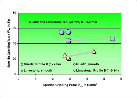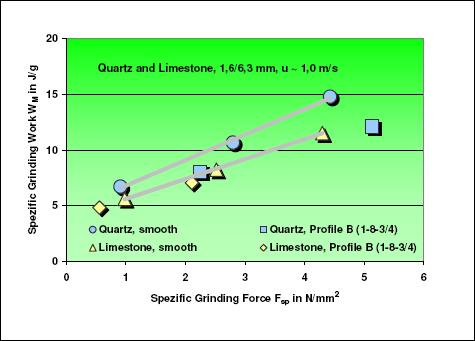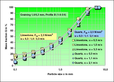 One-passage grinding of quartz and limestone, 1.6/6.3 mm, profile B (1-8-3/4) / Institute for Mineral Processing of the Technical University Clausthal (Germany, 1989) |