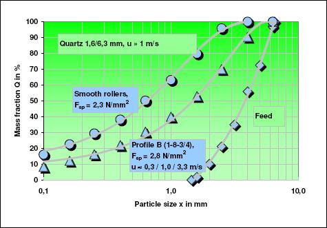 But at the same level of specific grinding force the comminution effect may depend on the roller surface structure. In the diagram below the product particle size distributions for a coarse quartz graining 1,6/6,3 mm after a stressing with 2,3 N/mm² respectively 2,8 N/mm² with smooth and moulded rollers are compared. With profile B the grinding effect is lower but the throughput of 5,3 t/h is much higher than the throughput of 2,0 t/h with smooth rollers.The energy absorption which is resulting out of this is 4,1 J/g for moulded and 8,2 J/g for smooth rollers. |