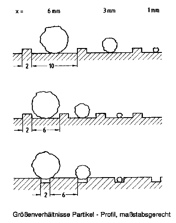 corrugation grooves with material coatings. For open profiles the first sketch demonstrates the situation true to scale for the maximum particle sizes of the different grainings. The next picture shows the condition for the
