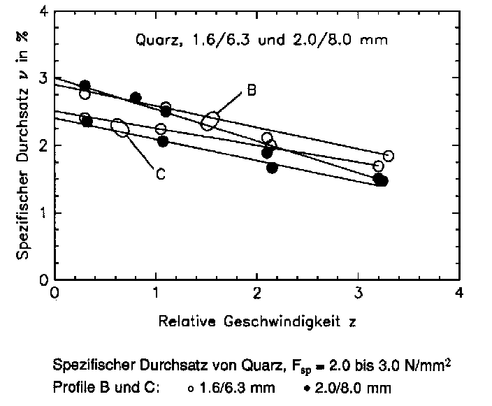 Specific throughput quartz 1,6/6,3 mm with different roller profiles / Dissertation Lubjuhn, 1992 [25]