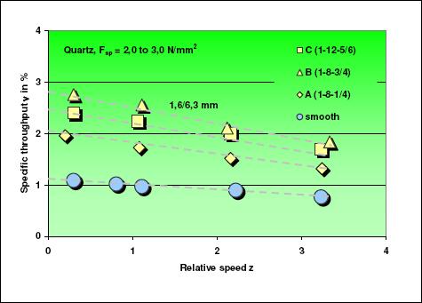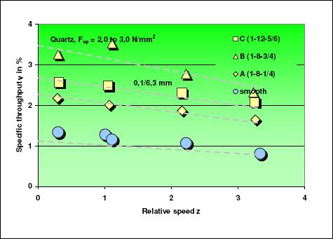 Specific throughput quartz 0,25/1,0 mm with different roller profiles / Dissertation Lubjuhn, 1992 [25]