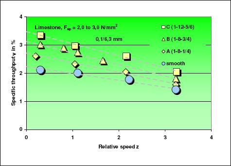 Specific throughput limestone 0,25/1,0 mm with different roller profiles / Dissert. Lubjuhn, 1992 [25]